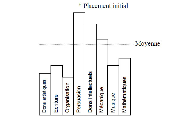 Beaucoup d’embauches sont maintenant soumises à des tests d’aptitude. Les résultats de ces tests sont appelés «profils», et schématisés par une représentation graphique des compétences du candidat. Voici un de ces profils :